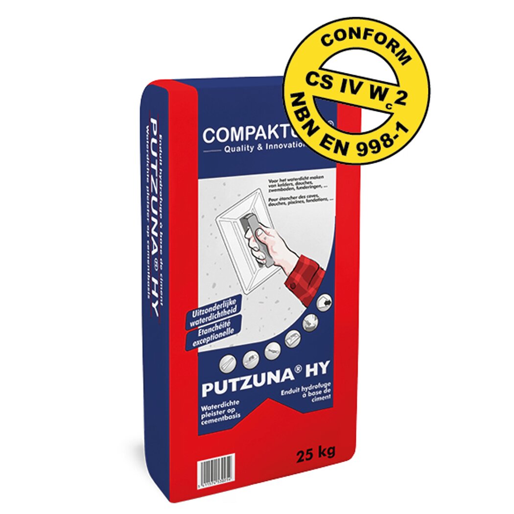 PUTZUNA® HY est composé de ciment, de sables de quartz sélectionnés et d’additifs de haute qualité. Par simple ajout d’eau, on obtient un enduit étanche avec une haute résistance finale.