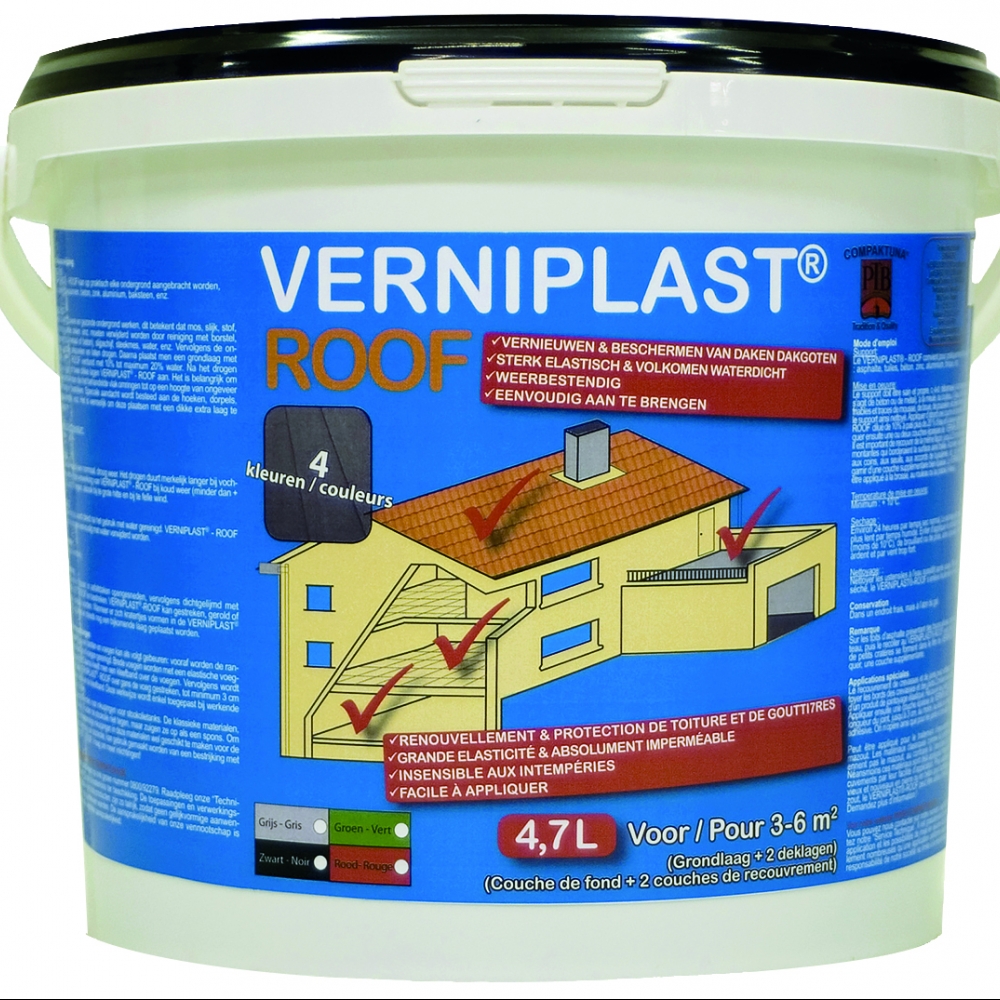 le VERNIPLAST®ROOF est un revêtement peinture Polymère modifié mono composant étanche, créant une membrane très élastique (élasticité ± 300%) excellente adhérence sur tous les supports usuels, qui permet de recouvrir sans problèmes les fissures, crevasses ainsi que les jonctions de bassin. Protection ou remise en état de toitures et de gouttières anciennes et nouvelle. Sous-couche imperméable pour terrasses, douche à l’italienne.